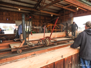 On the wish list for the Yamhill County Historical Society was a vintage sawmill. In 2007 the children of John and Bertha responded with the offer of theirs. The sawmill was disassembled, and wooden parts replaced, volunteers on the Historical Society grounds. A great part of the restoration job was done by the Tessman brothers, Alan and Dean, and by Chuck Kadell and Donnie King, plus other helping hands. By 2009 the mill was ready to operate. The dedication by the Tessman family took place at the 2009 Harvest Fest event. The power for the mill is a 43hp 1946 John Deere model W engine donated by the Bob Scharf family. The mill can handle up to a 28-inch diameter log, up to 16 feet long. Resulting lumber is used for projects within the Heritage Center. Slab wood is burned in the fire box of the steam tractor for its power, the excess sold for firewood, with funds returned to the mill’s treasury. The sawmill chairman and head sawyer in the beginning was Jerry Tessman, who was grandson of John D. Tessman. Today the sawmill chairman and head sawyer is Doc Green. Given new life as a teaching tool, the mill proves a popular attraction at events. A better second life for it cannot be imagined.