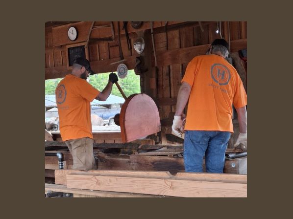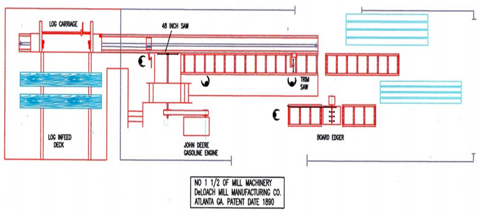 John D. Tessman bought the #1 1/2 DeLoach sawmill in 1920. It had been through a fire so John had to restore it to useable condition. The manufacture date at DeLoach Mill Mfg. Co. in Birmingham, Alabama, was between 1900 and 1905. The patent date was 1890. Mr. Tessman set the sawmill up at his father-in-law’s Beringer farm at Gibbs on Chehalem Mountain northeast of Newberg, Oregon. The Tessmans and Beringers powered the mill with a steam engine and sawed lumber from timber on their hillside farm. They built outbuildings and sawed for neighbors as well. It 1937 the mill was moved to John and Bertha (Beringer) Tessman’s farm adjacent to the Beringers, where they milled lumber for their home and outbuildings. At this location the 48-inch blade was powered by a 1928 Packard engine and later on by a WWII surplus Cadillac tank engine. It was last used on the farm in 1954.